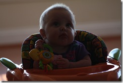 Besides Carter, Little sister has become familiar with all of the faces in the house and started showing a shyness for strangers. She is so smiley and happy most of the time. When Daddy comes walking in and says "I see you lookin' at me!" She gets her arms swinging with excitement. She says "Ba" and Da-Da" all the time now. And actually, here as of lately, she has been saying "Maaaa!" when she is upset and wants to be picked up! The girl knows her momma ;)